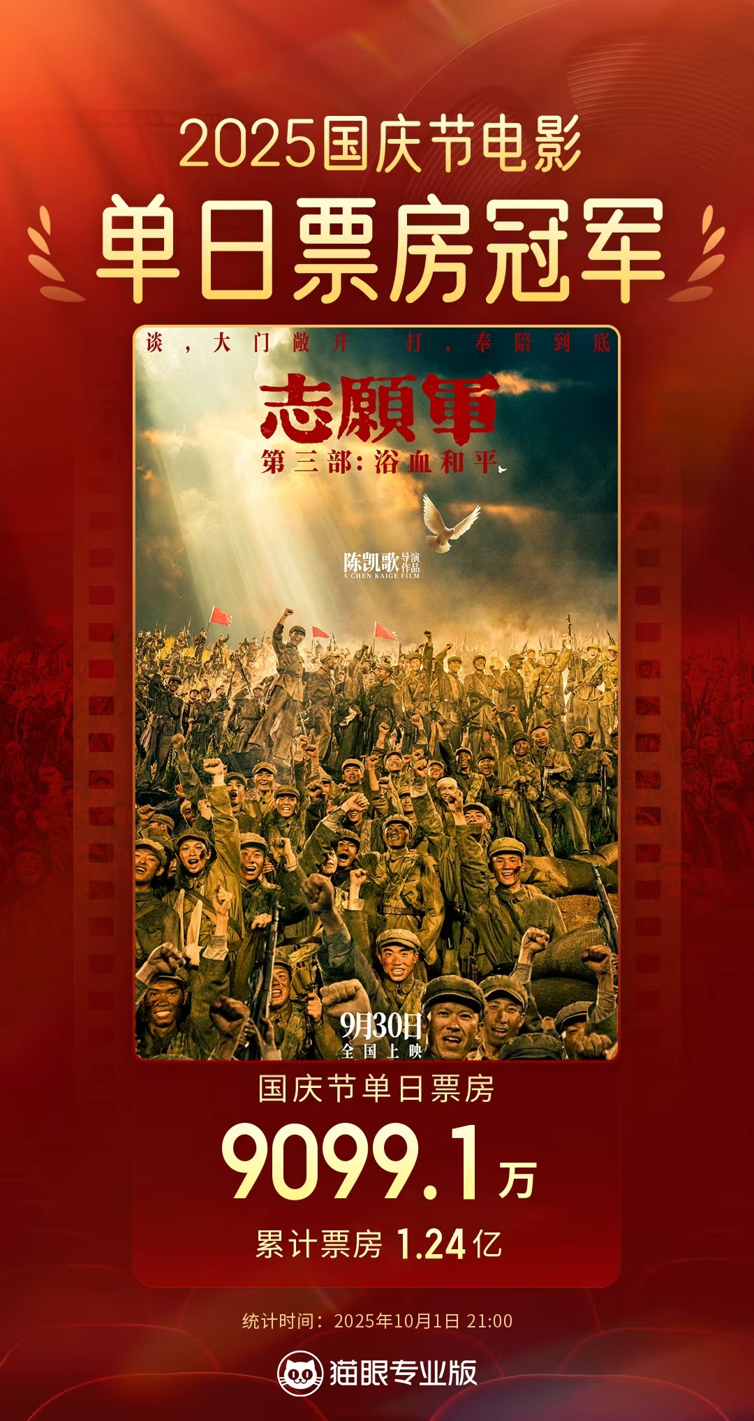 暂居票房榜冠军的《志愿军:浴血和平》是今年国庆档首部档期票房突破1亿元的影片。该片为陈凯歌执导的《志愿军》三部曲终章,聚焦抗美援朝战争第五次战役后直至签署停战协议期间“边打边谈”的作战历程,采用“文争武斗”的双线叙事结构:谈判桌线还原158次大会、733次小会、历时747天的停战谈判细节;战场线则延续前两部的制作质量,呈现外交战场与真实战场的交织。该片于9月30日正式上映,目前累计票房达1.24亿元,其中10月1日单日票房超9000万元,较上映首日出现大幅“逆跌”。