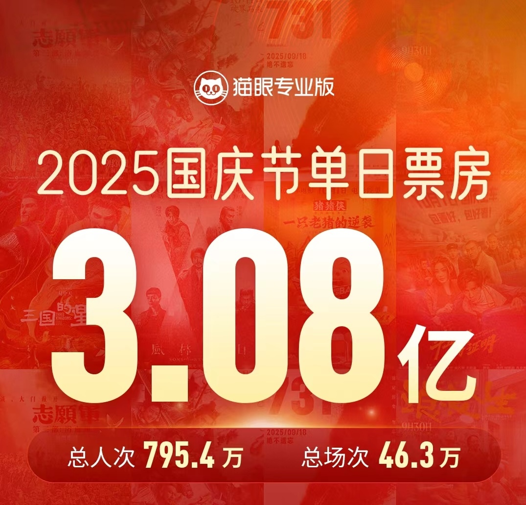 与此同时,2025年国庆档(10月1日—10月8日)总票房(含预售)达4.09亿元,总观影人次达1074万,总放映场次达149.9万。